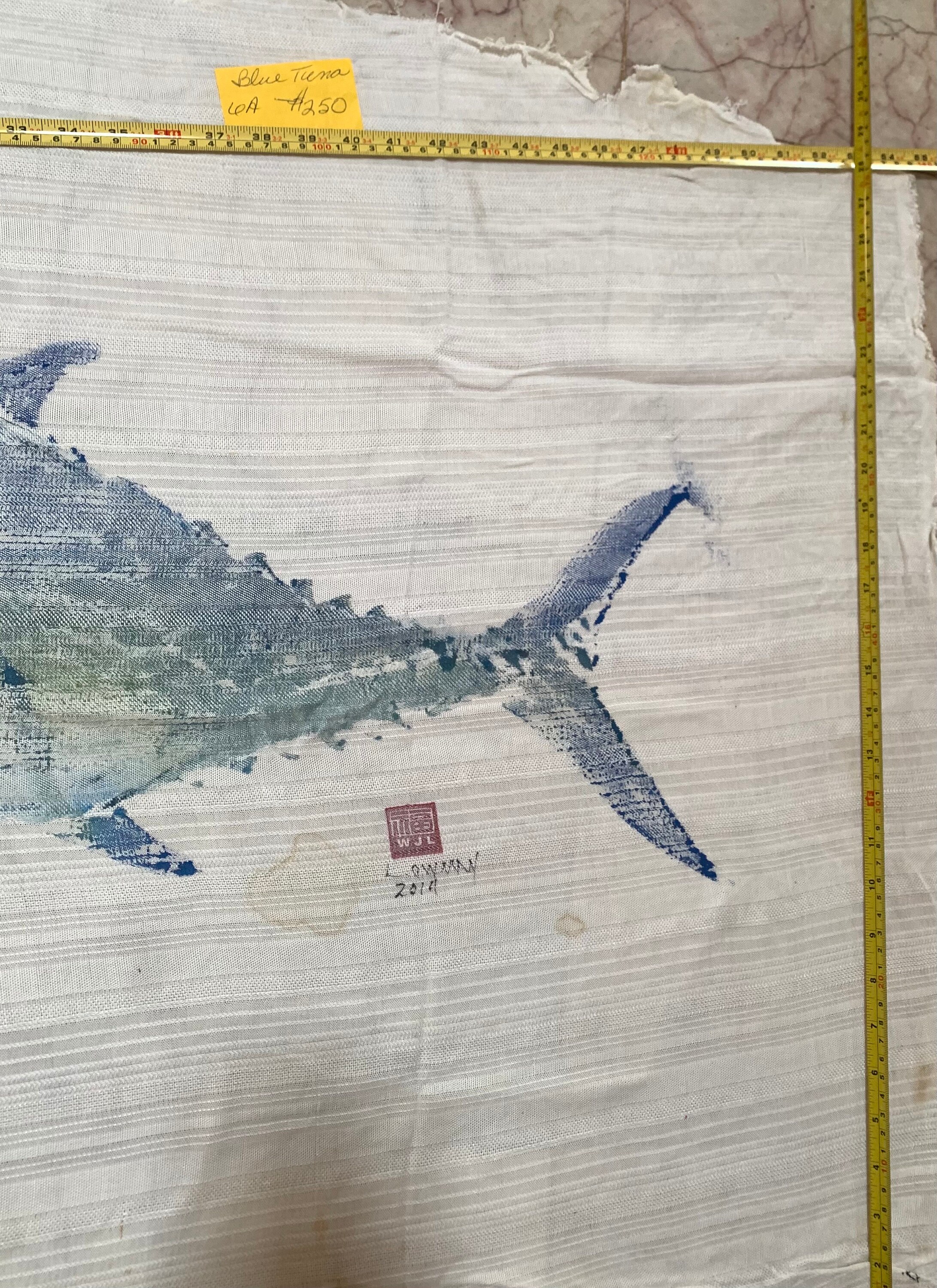 Gyotaku-style Blue Tuna made in 2014 with latex blue/green paint and yellow eyes; paint pressed on white cotton muslin fabric (unframed). They can be displayed with a hanging rod, matted & framed at your favorite framing shop, or attached to a display board of any kind.