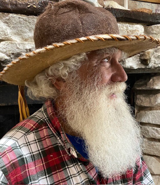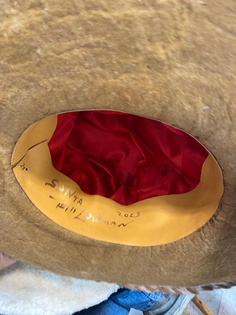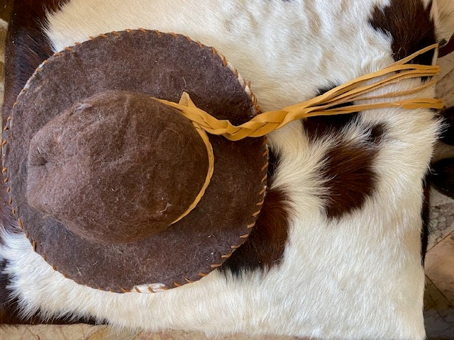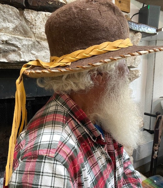 Handmade felt brown wool cowboy style hat with tan braided leather band and fringe, laced butter leather trim, and 100% American tan wool underneath with red poly-satin lining. 3-3.5 inch brim. Unisex and hat size is 23 inches. Hat is signed and dated inside. Made with 100% wool and is sourced domestic and exotic.