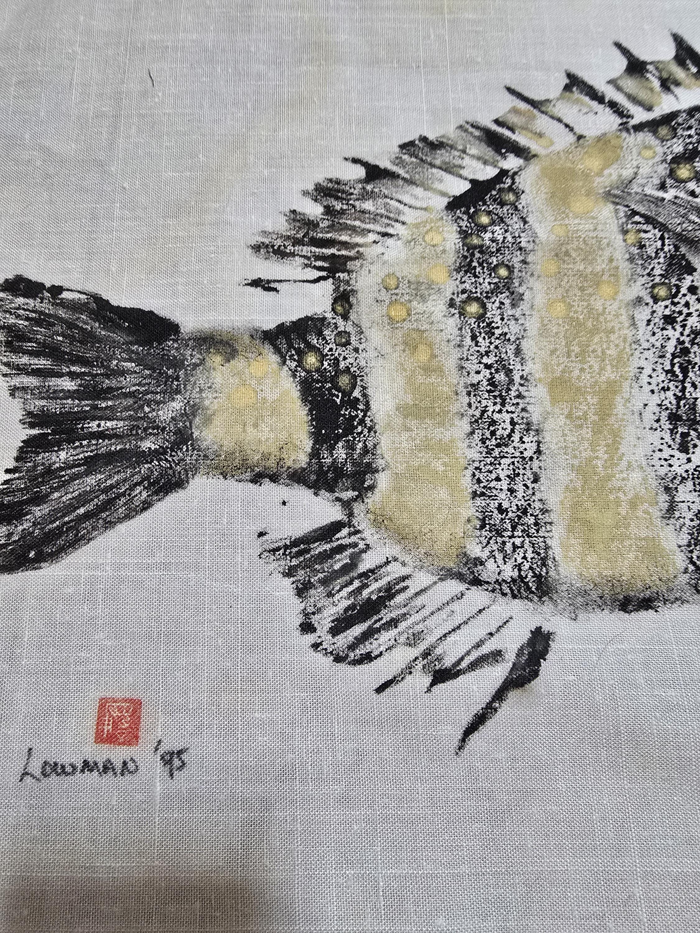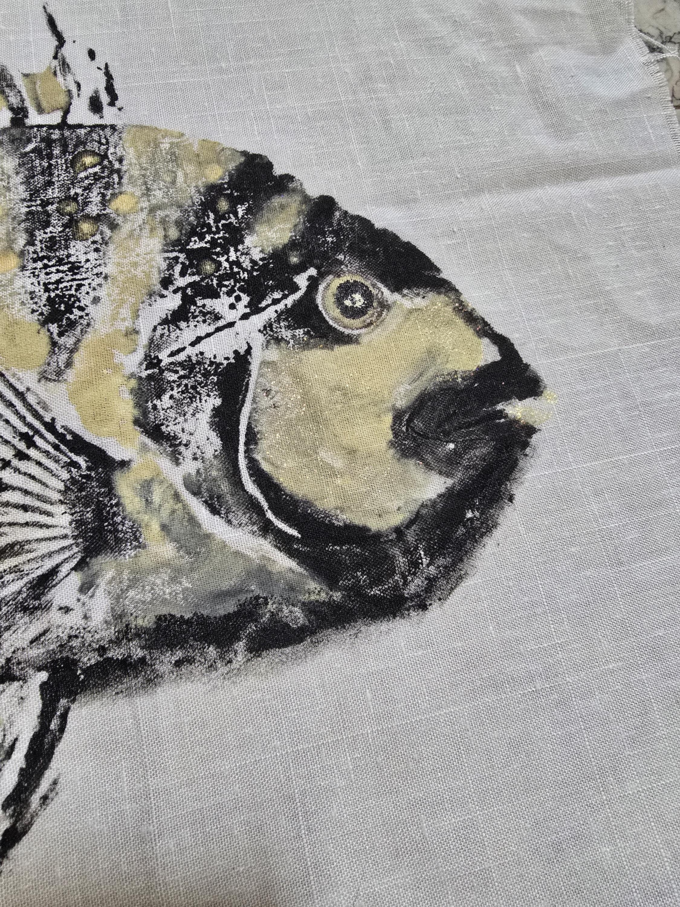 What a catch! This Gyotaku-style sheep head yellow and black striped fish was made in 1995 with latex paint pressed on white cotton muslin fabric (unframed) with golden glitter for the final touches. Fish enthusiast and fans of the Gyotaku-style Japanese-inspired fish art would appreciate this adorable fish print. Give this to the fisherman (or fisherwoman) in your life as a gift for any occasion. This one of a kind fish print originally fished from Port Aransas, Texas can be displayed with a hanging rod, matted & framed at your favorite framing shop, or attached to a display board of any kind.