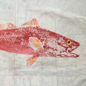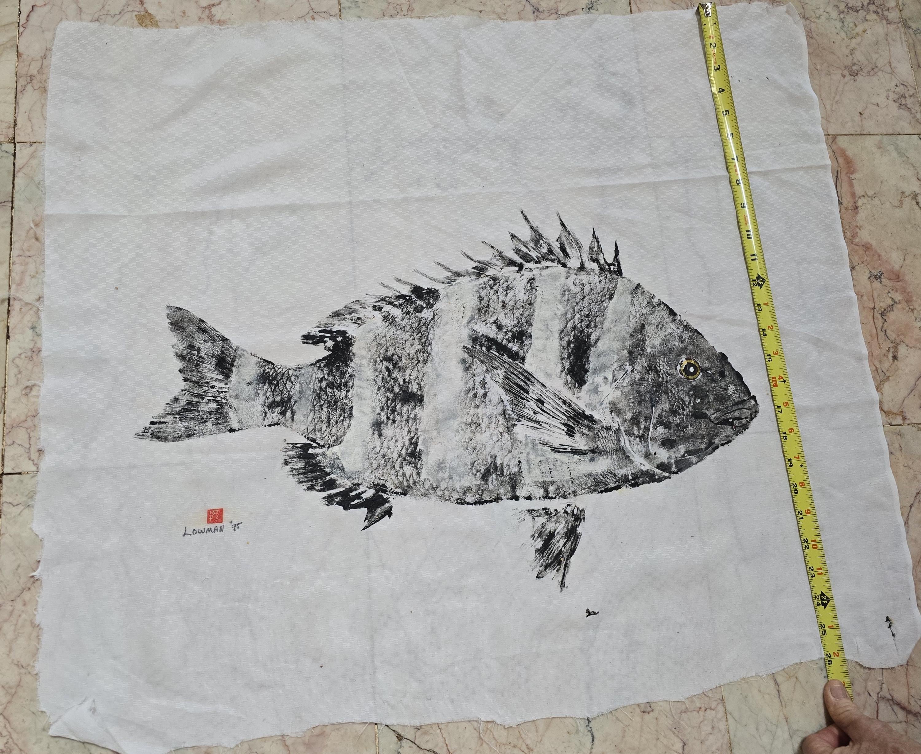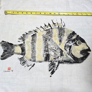 Nice catch! This Gyotaku-style sheep head white and black striped fish was made in 1995 with latex paint pressed on white cotton muslin fabric (unframed). Fish enthusiast and fans of the Gyotaku-style Japanese-inspired fish art would appreciate this adorable fish print. Give this to the fisherman (or fisherwoman) in your life as a gift for any occasion. This one of a kind fish print originally fished from Port Aransas, Texas can be displayed with a hanging rod, matted & framed at your favorite framing shop, or attached to a display board of any kind.