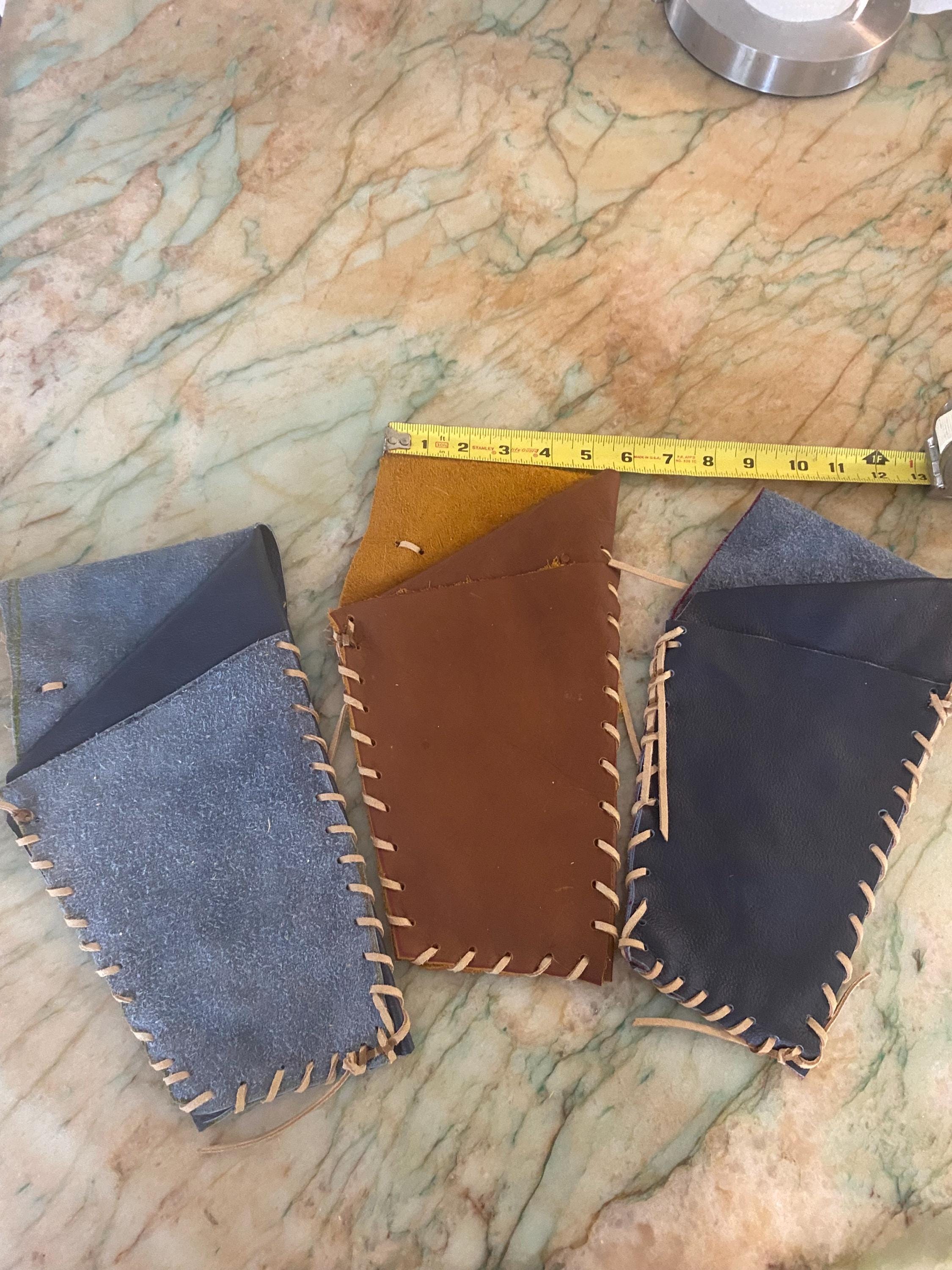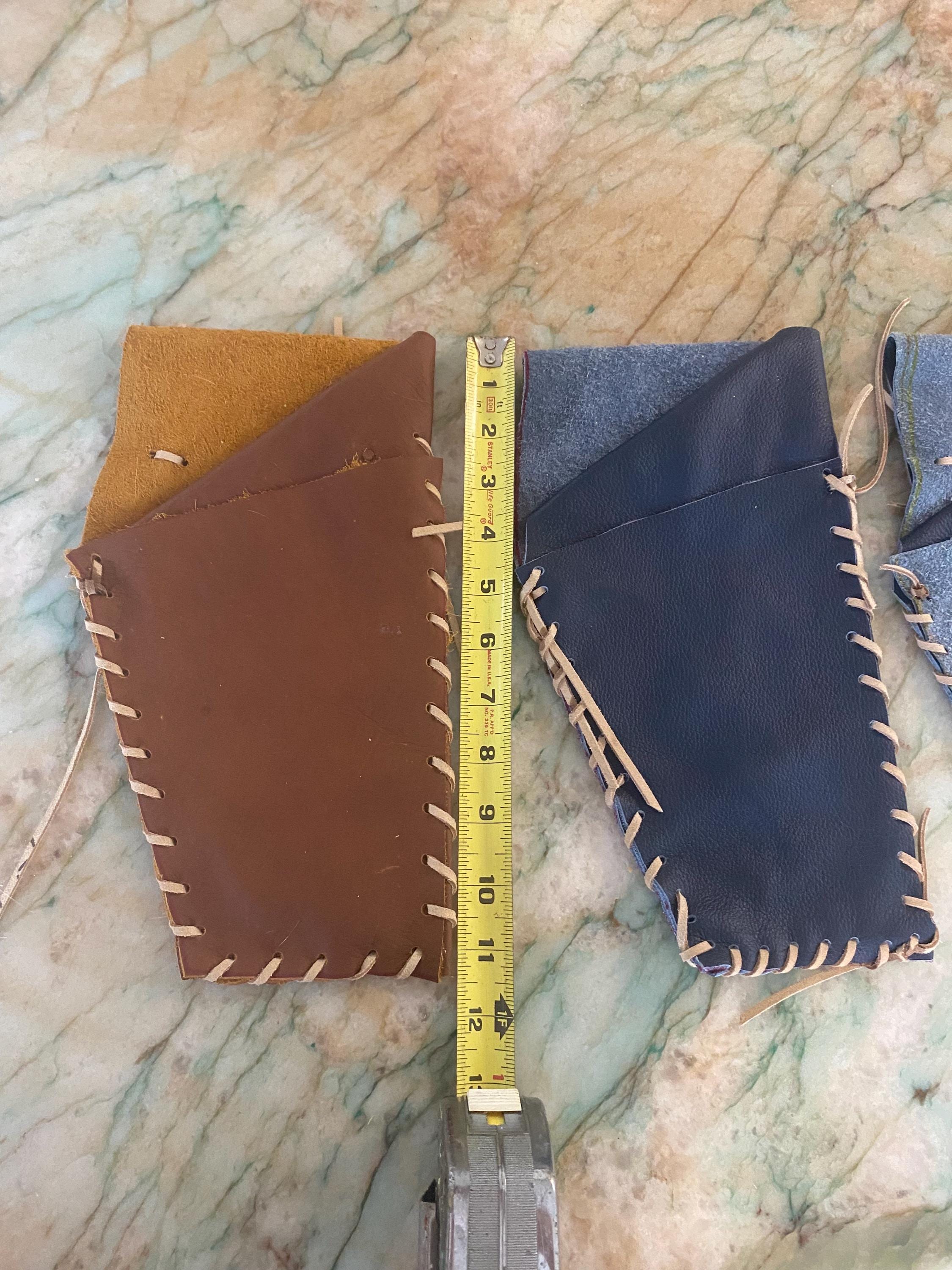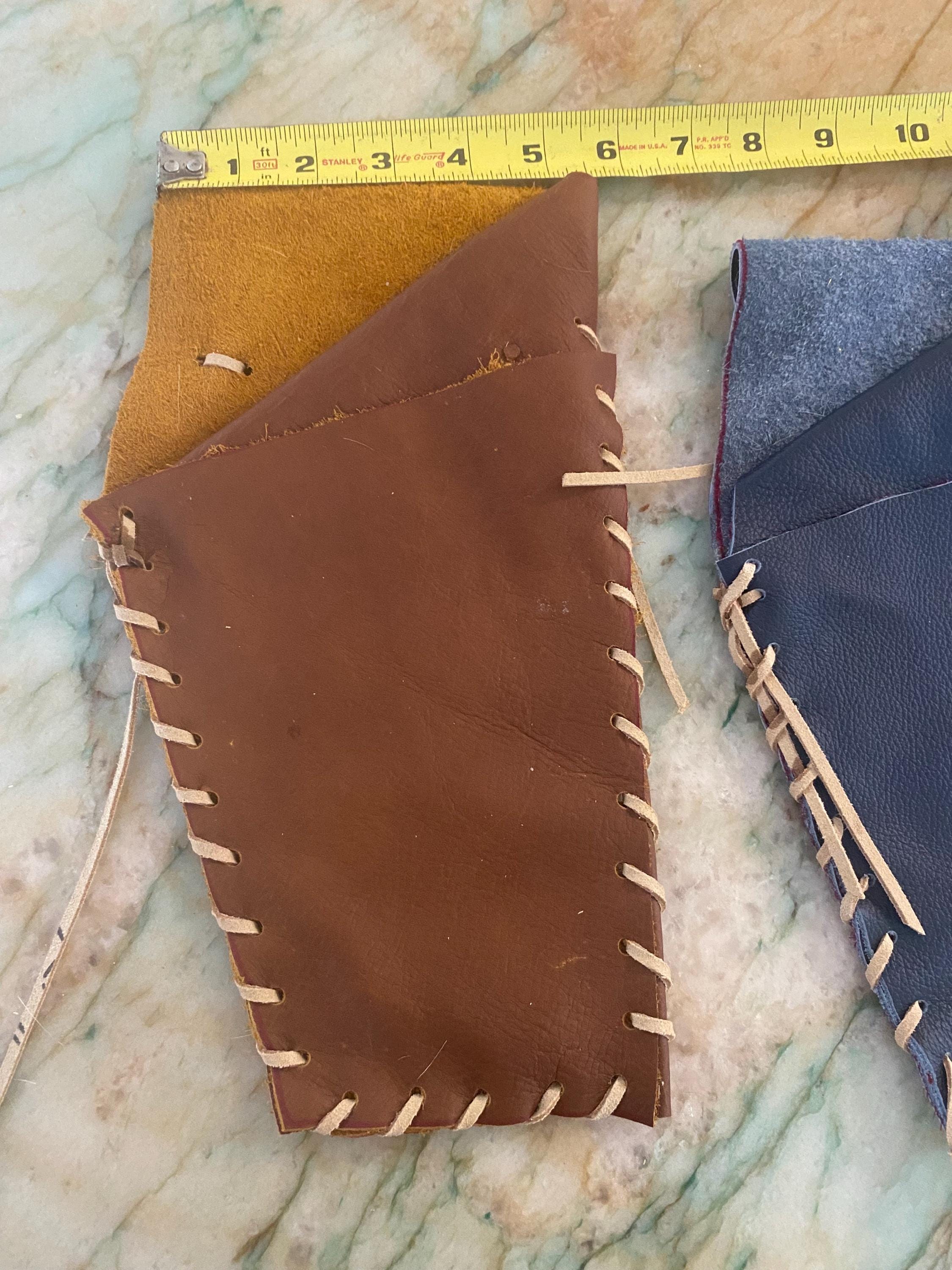 Perfect for cosplay, rennfaires, comic cons, everyday leather fashion, gardening, construction work, and more, these cowhide leather phone holders are made for attaching to your belt. Available colors are blue and brown and are made to order. They are stitch fabricated with beige leather lace and have two pocket compartments to hold your cell phone and other tools such as pocket watches, gardening tools, construction tools, and automotive tools.